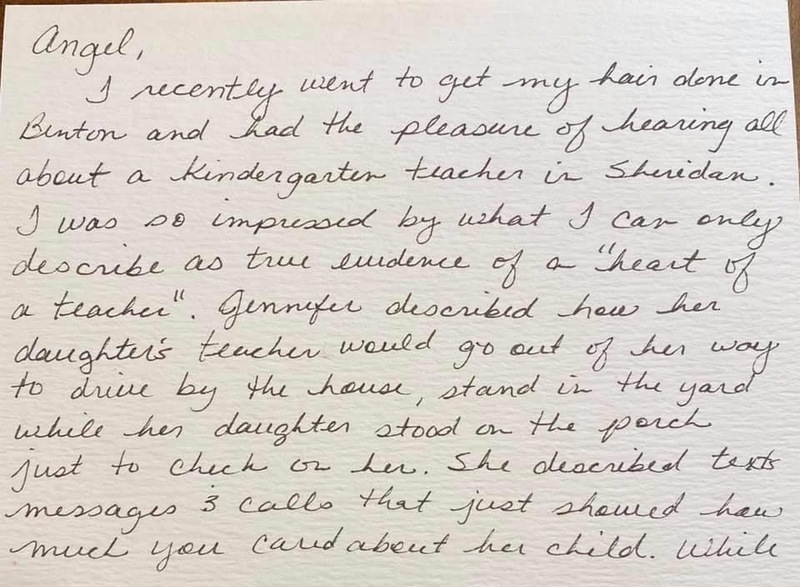 "I recently went to get my hair done in Benton and had the pleasure of hearing all about a kindergarten teacher in Sheridan. I was so impressed by what I can only describe as true evidence of a “heart of a teacher.” Jennifer described how her daughter’s teacher would go out of her way to drive by the house, stand in the yard while her daughter stood on the porch just to check on her. She described text messages and calls that just showed how much you cared about her child. While so much of the attention right now is on remote instruction, acts of genuine care and compassion are really the difference makers in education.