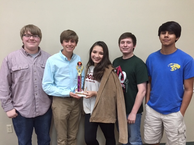 Team B won five of their six games and received the first runner-up trophy. Pictured from left are Caleb Red, Ben Trussell, Catherine Anderson, Grant Dawson, and Brendan Crutchfield. Although Watson Chapel received the top trophy, they were third in total scoring (1805) of the 6 matches, behind White Hall’s 1860 points and Sheridan’s 1830. Sheridan’s only loss was by five points. White Hall placed second runner up.